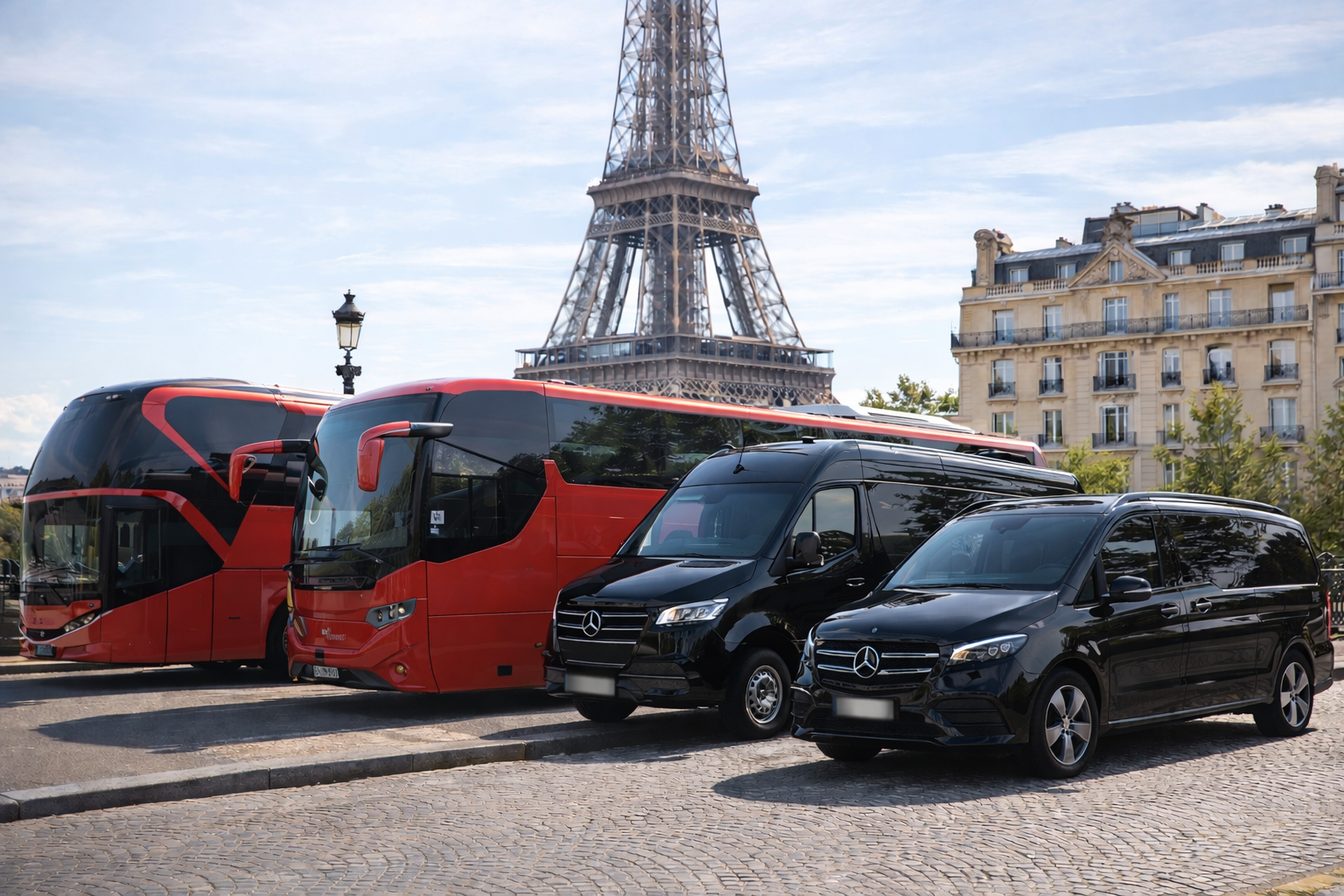 Notre flotte se compose de vans, minibus, autocars de grand tourisme jusqu'à 80 places, ainsi que de véhicules de luxe, afin de vous garantir confort, sécurité et élégance à chaque trajet.